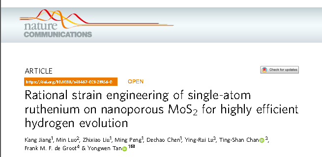 近日,国际知名综合类期刊《Nature Communications》在线发表了谭勇文教授团队题为“Rational strain engineering of single-atom ruthenium on nanoporous MoS2 for highly efficient hydrogen evolution”的最新研究成果。课题组博士研究生蒋康为第一作者,谭勇文教授为通讯作者。伟德体育官网博士研究生陈德超,刘智骁老师和彭鸣老师参与此工作。