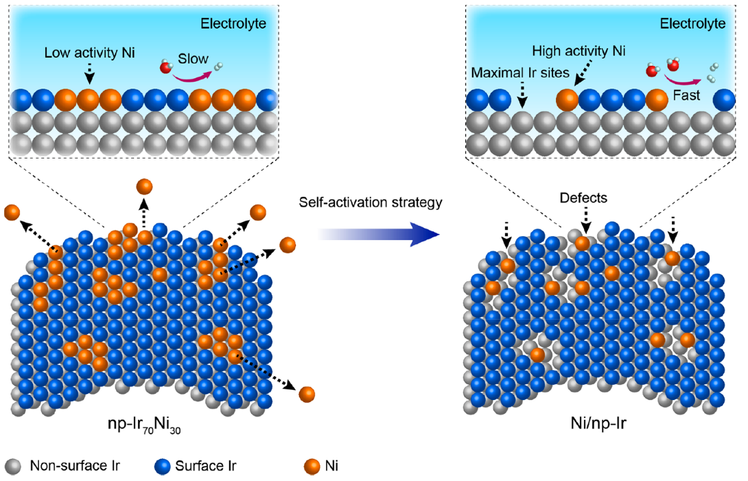 此外,谭勇文教授团队通过一种自活化的策略将修饰物种(Ni)的尺寸降低到原子层次,最大化催化剂中贵金属原子的利用率(图三)。得益于此,制备出的原子级Ni掺杂纳米多孔Ir催化剂具有优越的HER催化活性,优于目前报道的最先进的催化剂和市售催化剂(Pt/C和Ir/C)。进一步的原位XAS和密度泛函理论计算(DFT)表明,原子级的Ni位点不仅在实际反应条件下作为水裂解的高活性位点,同时能调节Ir位点的电子结构,从而降低了H-H耦合的能垒。国际知名材料期刊《ACS Nano》于近期在线发表了谭勇文教授团队题为“Self-Activated Catalytic Sites on Nanoporous Dilute Alloy for High-Efficiency Electrochemical Hydrogen Evolution”的纳米多孔单原子合金领域研究成果。硕士研究生余雅倩,博士研究生蒋康为该论文的共同第一作者。